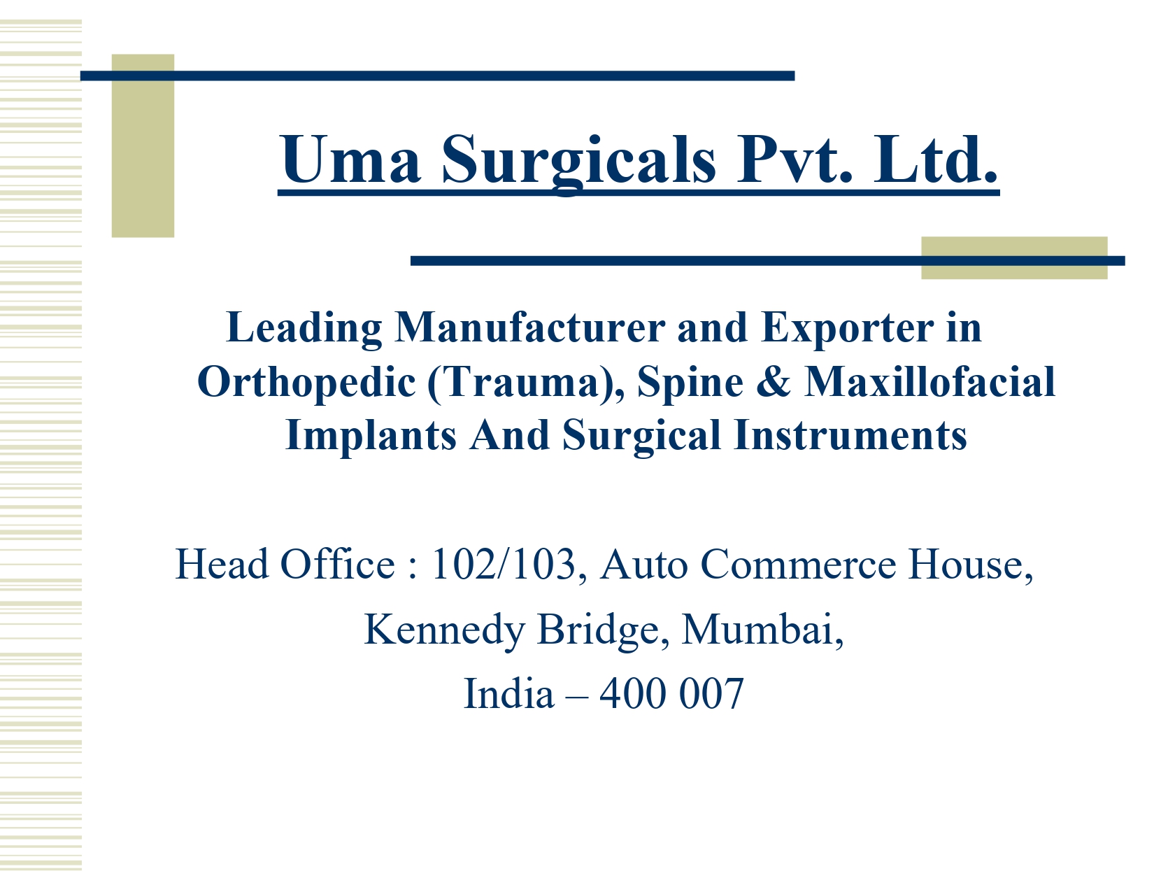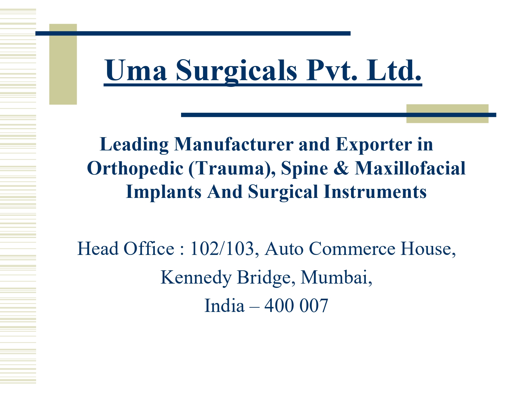 Founded in 1980 in a small workshop in South Mumbai, Uma Surgicals Pvt Ltd has grown into one of India’s most trusted and pioneering manufacturers of Orthopaedic (Trauma), Spine and Maxillofacial Implants, Surgical Instruments, and General Surgery Instruments.